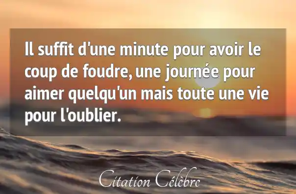 Il suffit d'une minute pour avoir le coup de foudre, une journée pour aimer quelqu'un mais toute une vie pour l'oublier.
