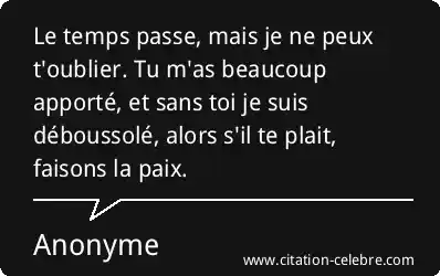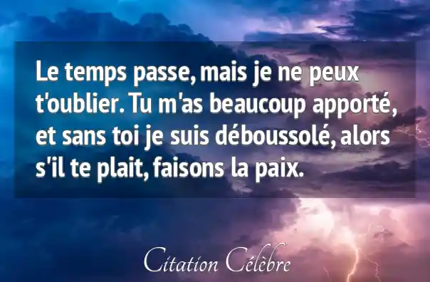 Le temps passe, mais je ne peux t'oublier. Tu m'as beaucoup apporté, et sans toi je suis déboussolé, alors s'il te plait, faisons la paix.