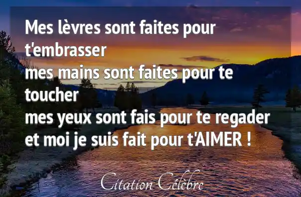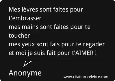 Mes lèvres sont faites pour t'embrassermes mains sont faites pour te touchermes yeux sont fais pour te regaderet moi je suis fait pour t'AIMER !