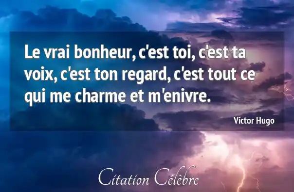 Cette citation, attribuée à Victor Hugo, exprime une définition passionnée et profondément personnelle du bonheur. Pour l'auteur, le véritable bonheur n'est pas une entité abstraite ou une accumulation de biens matériels, mais il est entièrement et exclusivement incarné par une personne aimée. La présence, la voix, et le regard de cet être suffisent à créer un état de charme et d'ivresse, traduisant un amour total, exclusif et enivrant.