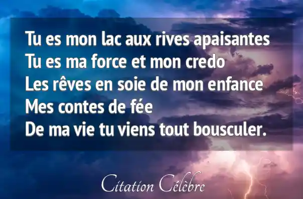 Tu es mon lac aux rives apaisantes Tu es ma force et mon credo Les rêves en soie de mon enfance Mes contes de fée De ma vie tu viens tout bousculer.