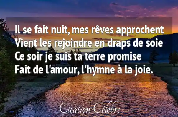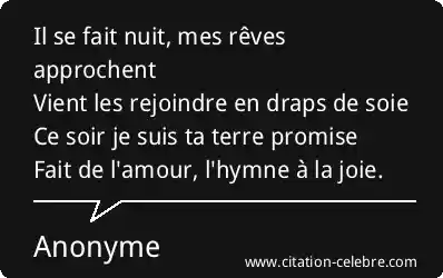 Il se fait nuit, mes rêves approchentVient les rejoindre en draps de soieCe soir je suis ta terre promiseFait de l'amour, l'hymne à la joie.