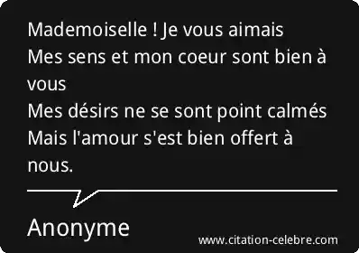 Mademoiselle ! Je vous aimaisMes sens et mon coeur sont bien à vousMes désirs ne se sont point calmésMais l'amour s'est bien offert à nous.