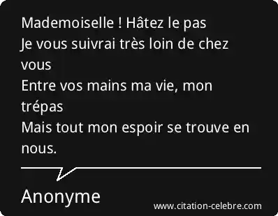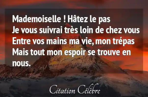 Mademoiselle ! Hâtez le pasJe vous suivrai très loin de chez vousEntre vos mains ma vie, mon trépasMais tout mon espoir se trouve en nous.
