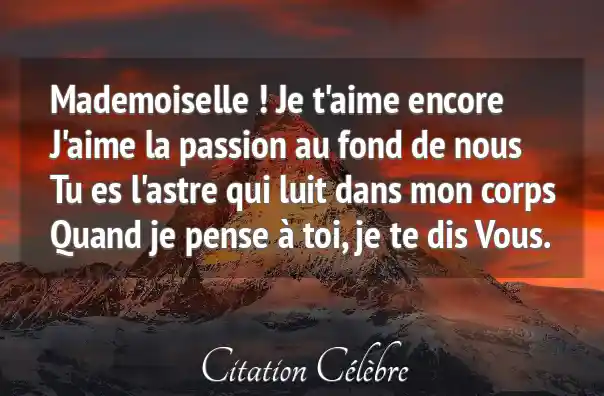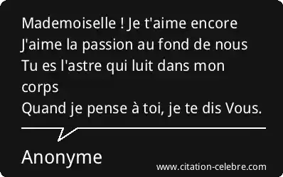 Mademoiselle ! Je t'aime encoreJ'aime la passion au fond de nousTu es l'astre qui luit dans mon corpsQuand je pense à toi, je te dis Vous.