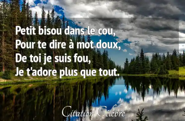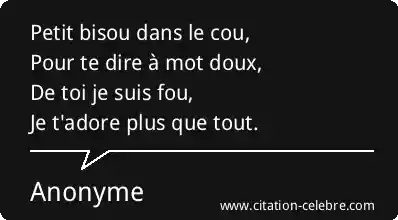 Cette courte citation est une déclaration d'amour simple et directe. Elle exprime une affection intense et exclusive envers une personne aimée. Le geste initial, le « Petit bisou dans le cou », est une marque de tendresse physique et d'intimité, servant d'introduction à la déclaration verbale qui suit. Le message principal est l'adoration et la passion ("De toi je suis fou, Je t'adore plus que tout").