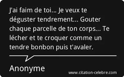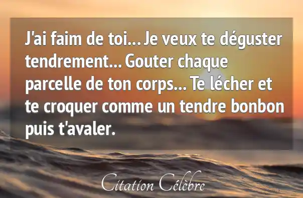 Cette citation exprime un désir intense et passionnel pour une autre personne, utilisant la métaphore de la faim et de la dégustation. Il s'agit d'une faim qui dépasse le simple besoin physique pour s'inscrire dans une quête de possession totale et sensuelle de l'être aimé. Le vocabulaire employé, tel que "déguster", "goûter", "lécher", "croquer" et "avaler", traduit une volonté d'explorer et d'intégrer l'autre dans son entièreté, d'une manière à la fois tendre ("tendrement", "tendre bonbon") et dévorante.