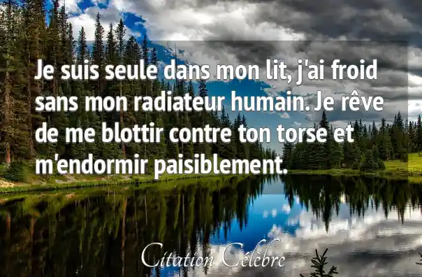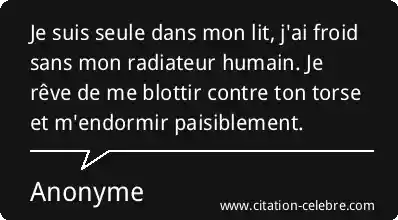 Je suis seule dans mon lit, j'ai froid sans mon radiateur humain. Je rêve de me blottir contre ton torse et m'endormir paisiblement.
