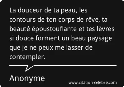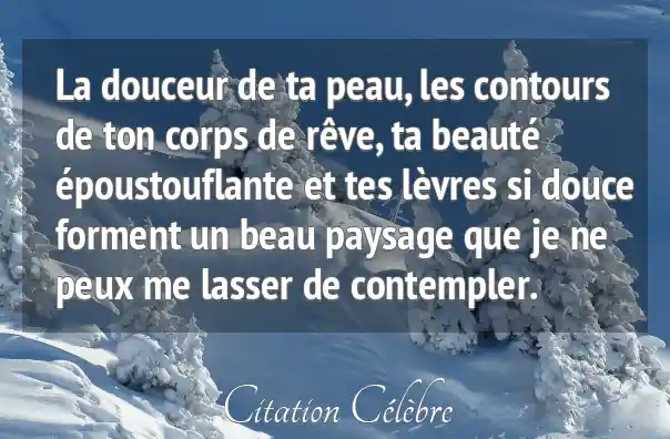 - Une métaphore de l'attraction physique : La citation détaille les éléments de l'attirance (la peau, les contours, les lèvres) pour mieux souligner leur impact global, qui est un paysage complet et harmonieux.