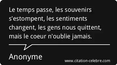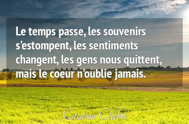 - Structure en opposition : La citation est construite sur une série de propositions négatives ou évolutives ("passe", "s'estompent", "changent", "quittent") qui culminent dans une affirmation forte et résolue, introduite par la conjonction de contraste "mais" ("le cœur n'oublie jamais").