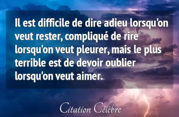 - La première partie, « Il est difficile de dire adieu lorsqu'on veut rester », évoque la peine de la séparation imposée, lorsque le cœur aspire à la présence.