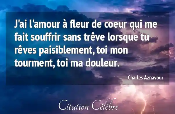 J'ai l'amour à fleur de coeur qui me fait souffrir sans trêve lorsque tu rêves paisiblement, toi mon tourment, toi ma douleur.