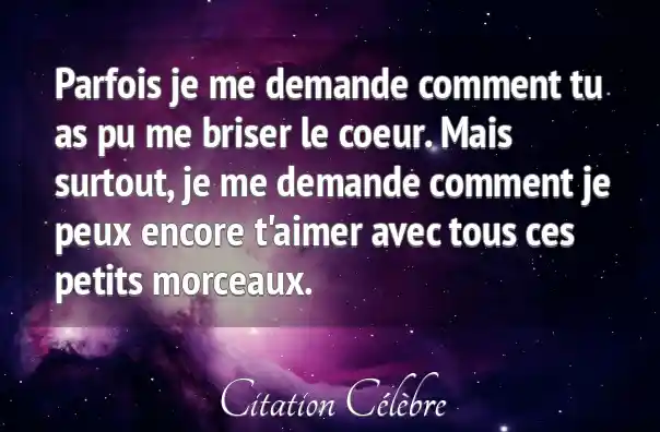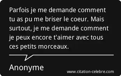 Parfois je me demande comment tu as pu me briser le coeur. Mais surtout, je me demande comment je peux encore t'aimer avec tous ces petits morceaux.