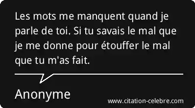 Les mots me manquent quand je parle de toi. Si tu savais le mal que je me donne pour étouffer le mal que tu m'as fait.