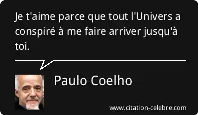 Cette célèbre phrase exprime une vision de l'amour qui dépasse la simple rencontre fortuite. Elle suggère que la relation amoureuse est le fruit d'une série d'événements et de circonstances orchestrés, non pas par le hasard, mais par une force supérieure ou une intention cosmique, ici appelée l'Univers. L'idée centrale est que l'arrivée de l'être aimé dans la vie de l'individu n'est pas un accident, mais l'aboutissement d'un cheminement prédestiné, soutenu et guidé par le monde lui-même.