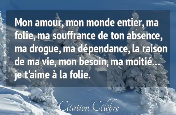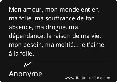 Mon amour, mon monde entier, ma folie, ma souffrance de ton absence, ma drogue, ma dépendance, la raison de ma vie, mon besoin, ma moitié... je t'aime à la folie.