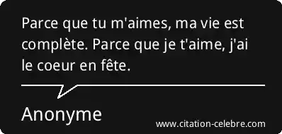 Parce que tu m'aimes, ma vie est complète. Parce que je t'aime, j'ai le coeur en fête.