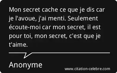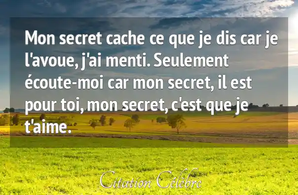 Mon secret cache ce que je dis car je l'avoue, j'ai menti. Seulement écoute-moi car mon secret, il est pour toi, mon secret, c'est que je t'aime.