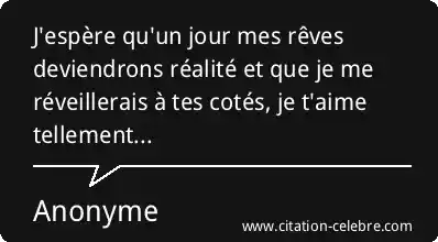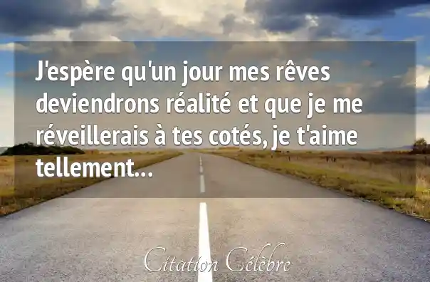 Cette citation exprime un désir profond et romantique. Elle est l'expression d'un souhait ardent de voir un rêve d'amour, celui de partager sa vie avec l'être aimé, se concrétiser. L'idée de se réveiller aux côtés de l'autre symbolise l'accomplissement ultime de cet amour, le passage du rêve à une réalité quotidienne et partagée. Le « je t'aime tellement... » final vient renforcer l'intensité de ce sentiment et la sincérité du souhait.
