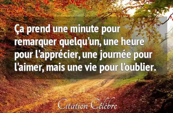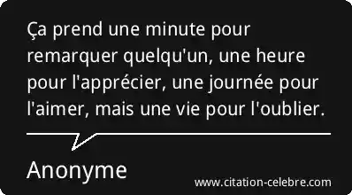 Ça prend une minute pour remarquer quelqu'un, une heure pour l'apprécier, une journée pour l'aimer, mais une vie pour l'oublier.
