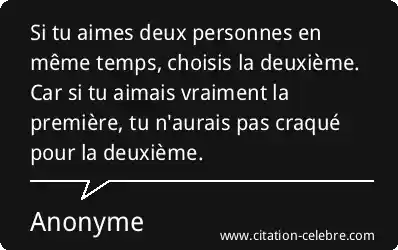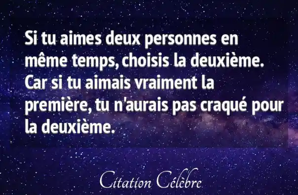 Cette citation aborde la complexité des sentiments amoureux lorsque l'on se trouve partagé entre deux personnes. Elle exprime l'idée qu'un véritable amour pour la première personne devrait être suffisamment fort et exclusif pour empêcher l'apparition d'un sentiment amoureux pour une seconde personne. Si ce second amour surgit, c'est la preuve, selon cette pensée, que le premier attachement n'était peut-être pas un amour profond et sincère, mais plutôt une affection, une habitude ou une relation qui laissait un vide.