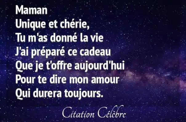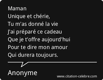 MamanUnique et chérie,Tu m'as donné la vieJ'ai préparé ce cadeauQue je t'offre aujourd'huiPour te dire mon amourQui durera toujours.