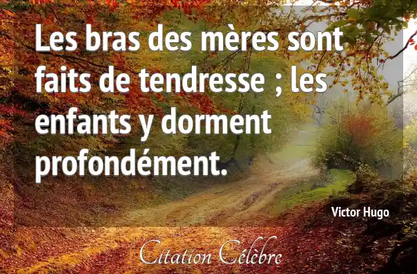 Cette célèbre citation de Victor Hugo, « Les bras des mères sont faits de tendresse ; les enfants y dorment profondément. », exprime de manière poétique l'idée que les bras d'une mère représentent le lieu suprême de la sécurité, du réconfort et de l'amour inconditionnel. La « tendresse » maternelle est la matière même de ce refuge, et c'est cette qualité qui permet à l'enfant de trouver un sommeil paisible, symbole de quiétude et de confiance absolue.