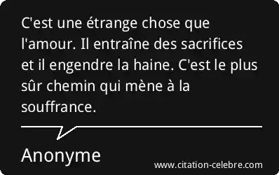 C'est une étrange chose que l'amour. Il entraîne des sacrifices et il engendre la haine. C'est le plus sûr chemin qui mène à la souffrance.