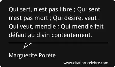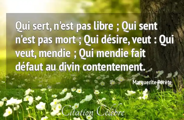 Qui sert, n'est pas libre ; Qui sent n'est pas mort ; Qui désire, veut : Qui veut, mendie ; Qui mendie fait défaut au divin contentement.