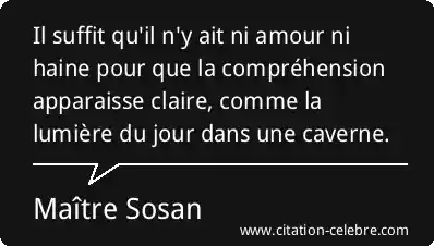 Il suffit qu'il n'y ait ni amour ni haine pour que la compréhension apparaisse claire, comme la lumière du jour dans une caverne.
