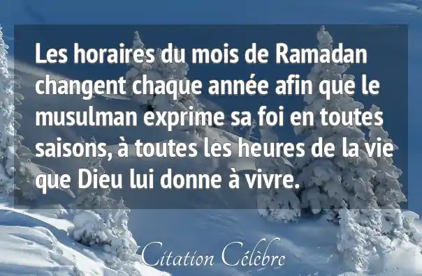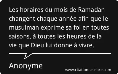 Les horaires du mois de Ramadan changent chaque année afin que le musulman exprime sa foi en toutes saisons, à toutes les heures de la vie que Dieu lui donne à vivre.