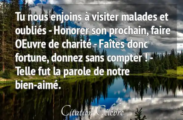 Tu nous enjoins à visiter malades et oubliés - Honorer son prochain, faire OEuvre de charité - Faîtes donc fortune, donnez sans compter ! - Telle fut la parole de notre bien-aimé.