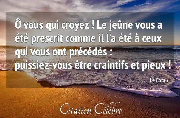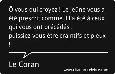 Ô vous qui croyez ! Le jeûne vous a été prescrit comme il l'a été à ceux qui vous ont précédés : puissiez-vous être craintifs et pieux !