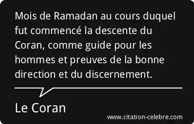 Mois de Ramadan au cours duquel fut commencé la descente du Coran, comme guide pour les hommes et preuves de la bonne direction et du discernement.