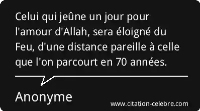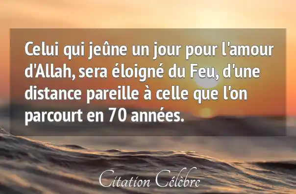Celui qui jeûne un jour pour l'amour d'Allah, sera éloigné du Feu, d'une distance pareille à celle que l'on parcourt en 70 années.
