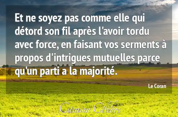 Et ne soyez pas comme elle qui détord son fil après l'avoir tordu avec force, en faisant vos serments à propos d'intrigues mutuelles parce qu'un parti a la majorité.