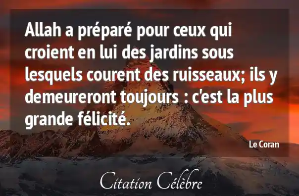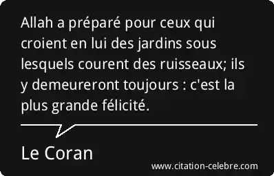 Allah a préparé pour ceux qui croient en lui des jardins sous lesquels courent des ruisseaux; ils y demeureront toujours : c'est la plus grande félicité.