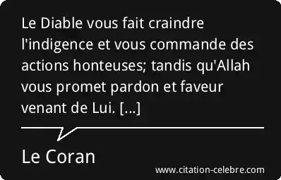 Le Diable vous fait craindre l'indigence et vous commande des actions honteuses; tandis qu'Allah vous promet pardon et faveur venant de Lui. [...]