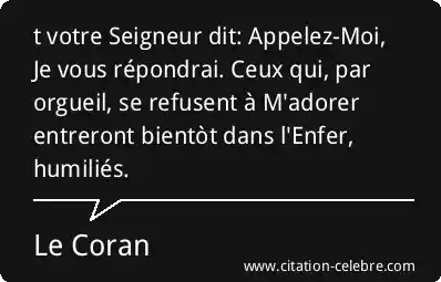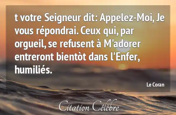 t votre Seigneur dit: Appelez-Moi, Je vous répondrai. Ceux qui, par orgueil, se refusent à M'adorer entreront bientòt dans l'Enfer, humiliés.