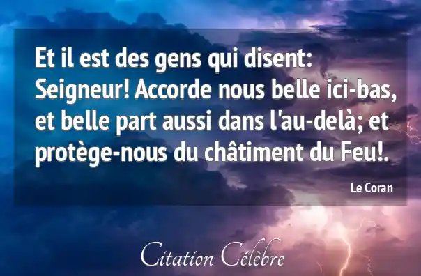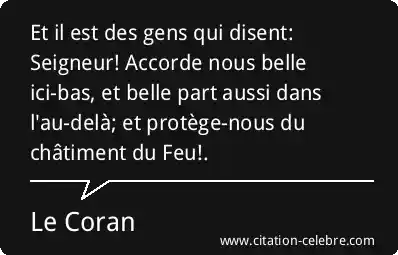 Et il est des gens qui disent: Seigneur! Accorde nous belle ici-bas, et belle part aussi dans l'au-delà; et protège-nous du châtiment du Feu!.
