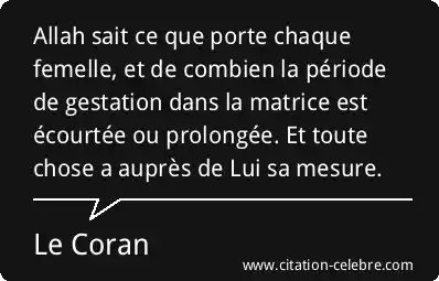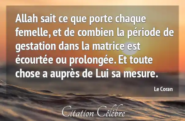 Allah sait ce que porte chaque femelle, et de combien la période de gestation dans la matrice est écourtée ou prolongée. Et toute chose a auprès de Lui sa mesure.