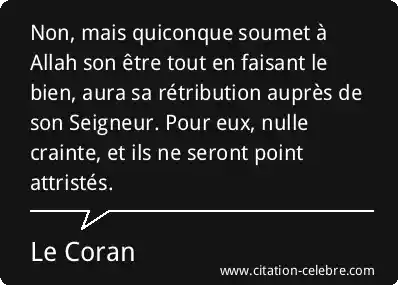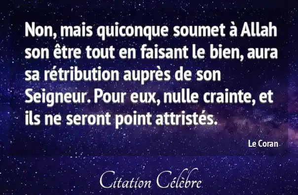Non, mais quiconque soumet à Allah son être tout en faisant le bien, aura sa rétribution auprès de son Seigneur. Pour eux, nulle crainte, et ils ne seront point attristés.