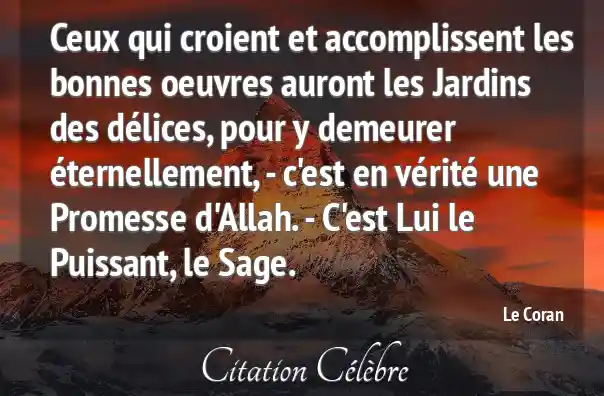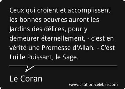 Ceux qui croient et accomplissent les bonnes oeuvres auront les Jardins des délices, pour y demeurer éternellement, - c'est en vérité une Promesse d'Allah. - C'est Lui le Puissant, le Sage.