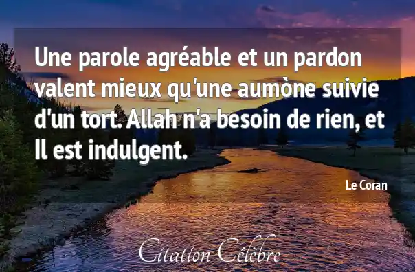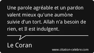 Une parole agréable et un pardon valent mieux qu'une aumòne suivie d'un tort. Allah n'a besoin de rien, et Il est indulgent.
