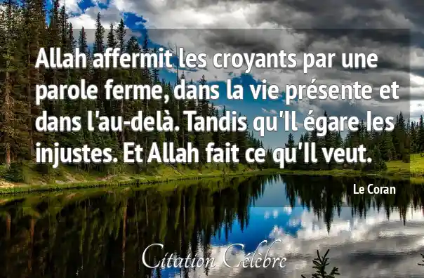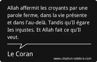 Allah affermit les croyants par une parole ferme, dans la vie présente et dans l'au-delà. Tandis qu'Il égare Ies injustes. Et Allah fait ce qu'Il veut.