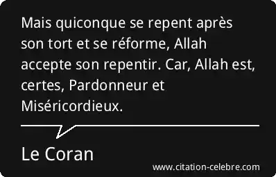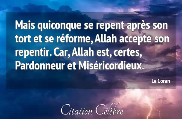 Mais quiconque se repent après son tort et se réforme, Allah accepte son repentir. Car, Allah est, certes, Pardonneur et Miséricordieux.