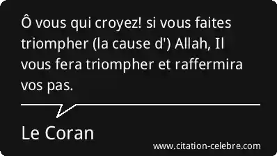 Ô vous qui croyez! si vous faites triompher (la cause d') Allah, Il vous fera triompher et raffermira vos pas.