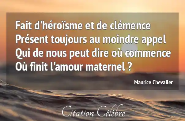 Fait d'héroïsme et de clémence Présent toujours au moindre appel Qui de nous peut dire où commence Où finit l'amour maternel ?