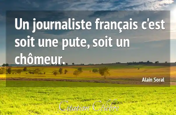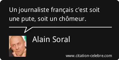 Cette citation, attribuée à Alain Soral, exprime une vision extrêmement polarisée et réductrice du journalisme français. Elle signifie, de manière provocatrice, qu'un journaliste n'aurait que deux destins possibles : soit il est complaisant, au service du pouvoir ou d'intérêts financiers (la "pute"), renonçant à son indépendance et à son éthique professionnelle pour assurer sa carrière ; soit il est intègre, refusant les compromissions, et se retrouve alors marginalisé, sans emploi, ou dans une situation précaire (le "chômeur").