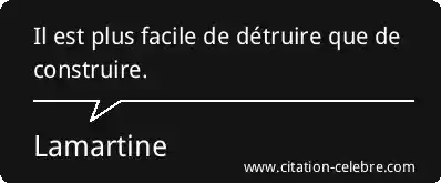 Cette célèbre formule d'Alphonse de Lamartine, "Il est plus facile de détruire que de construire", exprime une vérité fondamentale sur l'effort et le temps requis par ces deux actions. La destruction est souvent un acte rapide, nécessitant peu de préparation et d'énergie, car elle s'oppose à l'ordre et à la structure. À l'inverse, la construction (qu'elle soit matérielle, intellectuelle, morale ou sociale) exige de la patience, de la planification, de la coordination et un engagement soutenu. Elle est un processus lent qui accumule des efforts dans un but positif.